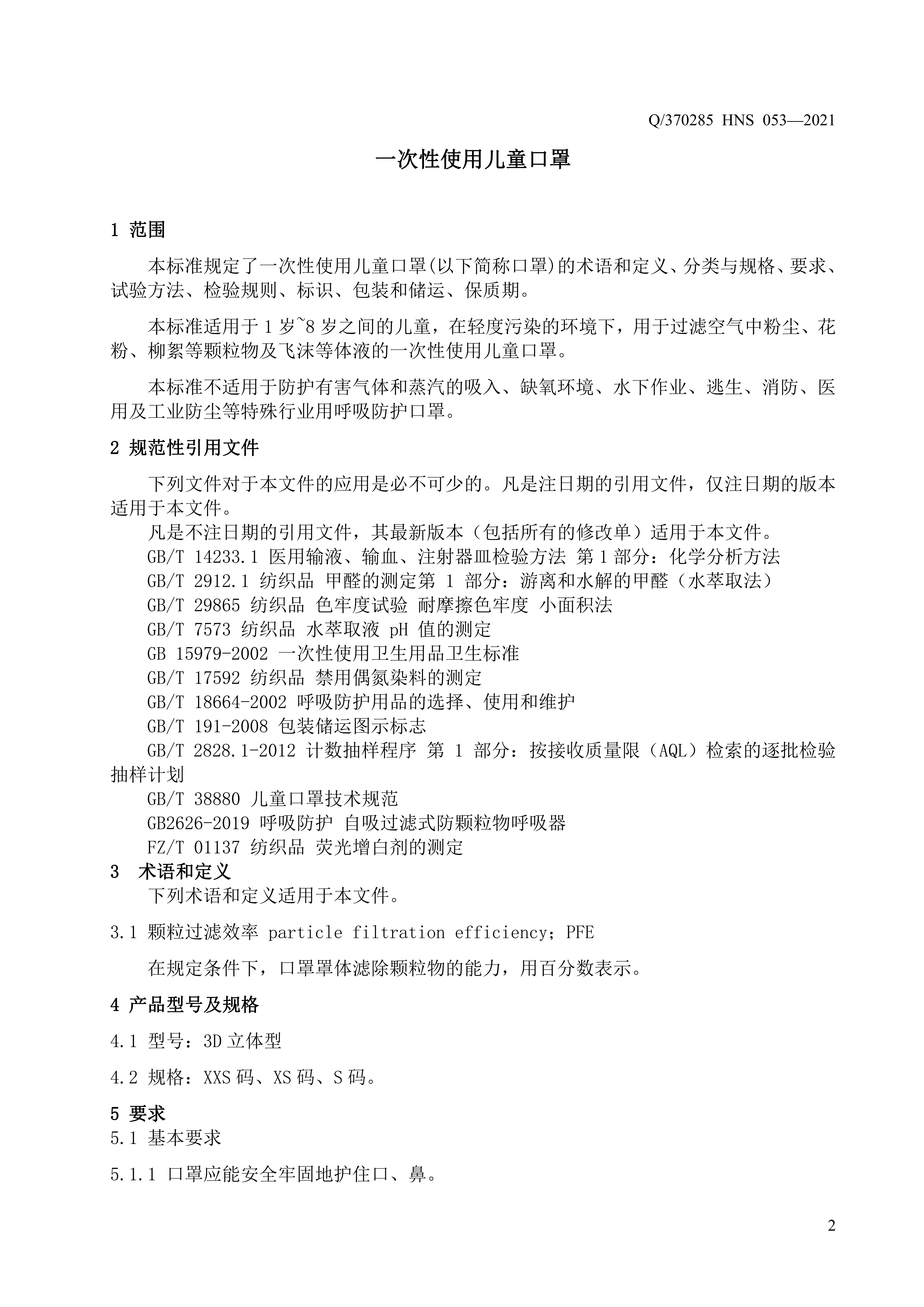 青岛海诺生物工程有限公司企业标准 — 一次性使用儿童口罩