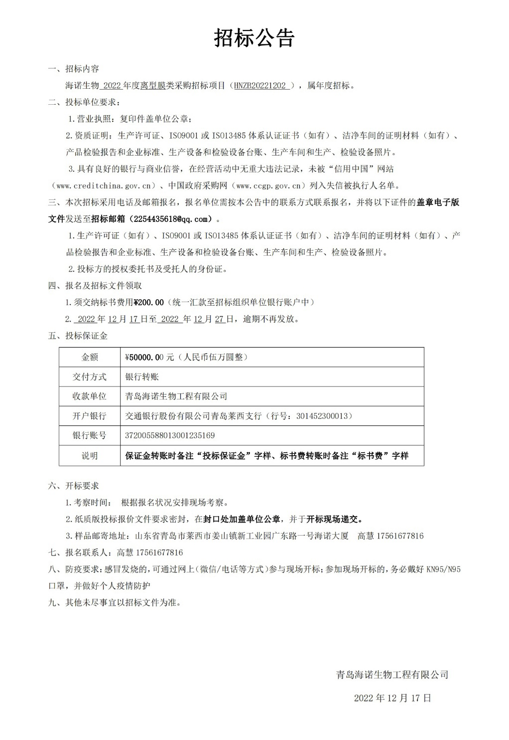 海诺生物2022年度离型膜类采购招标项目正式开启